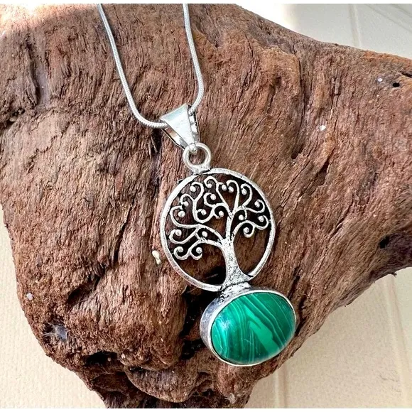 Brand NEW! Embrace the power of nature and spirituality with this 925 sterling silver Tree of Life pendant, featuring an intricate filigree design and a stunning oval Malachite gemstone. The Tree of Life symbolizes growth, strength, and connection to the universe, while Malachite is known as a stone of transformation and protection, bringing balance and positive energy to its wearer. *** With a Velvet Pouch and a cleaning clothing Ready for a gift. Necklace length size : 18” Pendant length size: 2” This elegant pendant hangs from a genuine leather cord, adding a natural and rustic touch to your style. Perfect for those who love symbolic jewelry, healing crystals, and bohemian accessories. ✔ Material: 925 Sterling Silver ✔ Stone: Genuine Malachite ✔ rope ✔ Ideal for: Spiritual jewelry lovers, nature enthusiasts, and meaningful gift-givers, self growth #TreeOfLifeNecklace #SterlingSilverJewelry #MalachitePendant #HealingJewelry #SpiritualNecklace #BohoJewelry #NatureInspired #HandmadeJewelry #GiftForHer #925SterlingSilver Tags: Opal, Larimar, Moonstone, pendant, Marcasite pendant, Moonstone pendant, Turquoise pendant necklace, Blue Topaz and Blue Copper Oyster Turquoise, chrysocolla pendant necklace, turquoise, Azurite, malachite, Labradorite, chrysoprase, chrysocolla, amethyst, Mystic Topaz, Apatite, Shattuckite, malachite, Abalone, sterling silver 925, tourmaline, Topaz, prehnite, gemstone, moonstone, topaz, blue gemstone, blue topaz, wild horse, labradorite, c