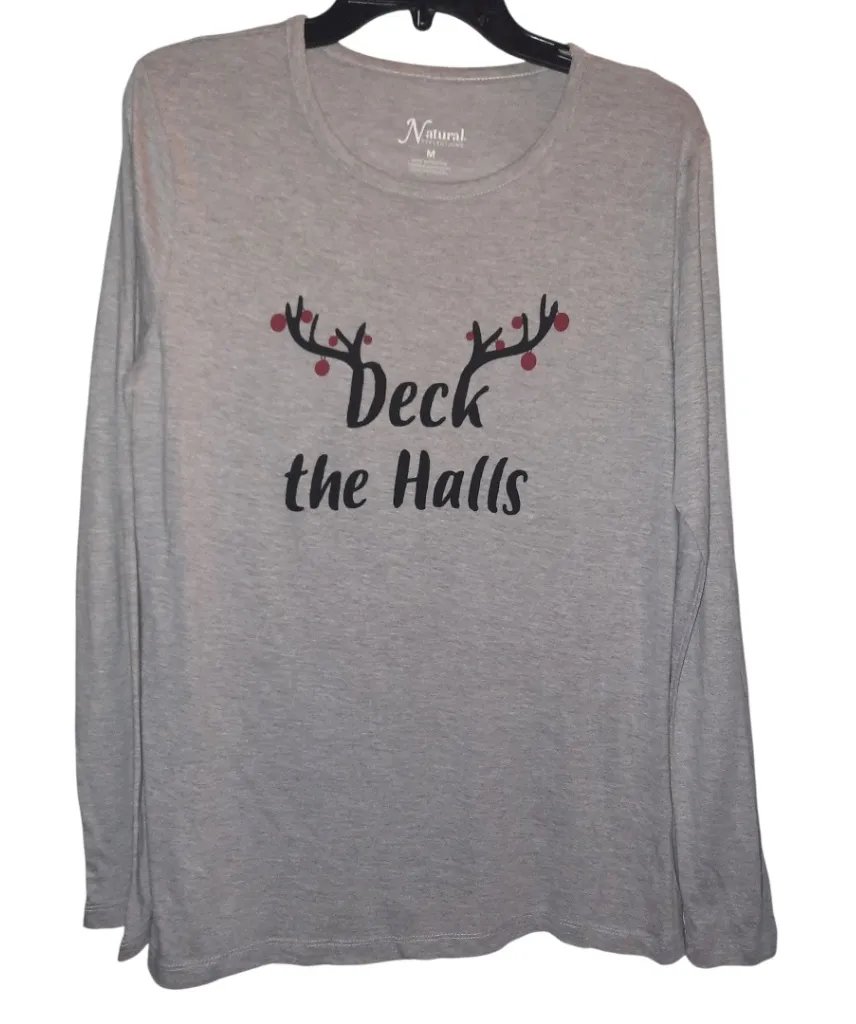 . The tee is 60% Cotton and 40% Polyester. Machine washable and lay flat to dry. Christmas. The front of the tee is "Deck the Halls". Casual. Soft. Stretchy. Smooth feeling. The tee shows signs of normal wear. Please see pictures for more details. The color of the tee is slightly darker than the pictures depict. With the garment laying flat, the measurements are as follows: armpit to armpit is 20 inches and from back of the neck to bottom of the tee is 28 inches. Preowned but in good condition.