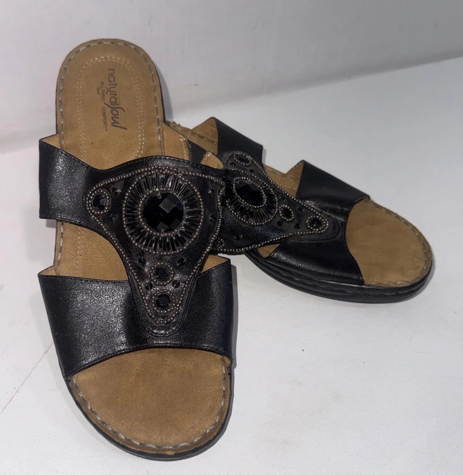 Natural Soul Black Wedge Beaded Sandals Slip on Shoes All Thru Comfort Faux Leather ALL MANMADE MATERIALS Shoes in USA Women’s Size 11M in good preowned condition Please See ALL Photos for MEASUREMENTS (when applicable) & more details as the photos serve as part of the description as well... Item shown in photos is the exact item you will receive. Please view all photos for more detailed description. Most Items are sourced from consignment/thrift stores or yard sales & are passing through my smoke free, PUP friendly, Scented detergent using household. All items are cross posted. All items are bagged, folded & placed in poly mailer for shipping unless other arrangements are made prior to purchase.