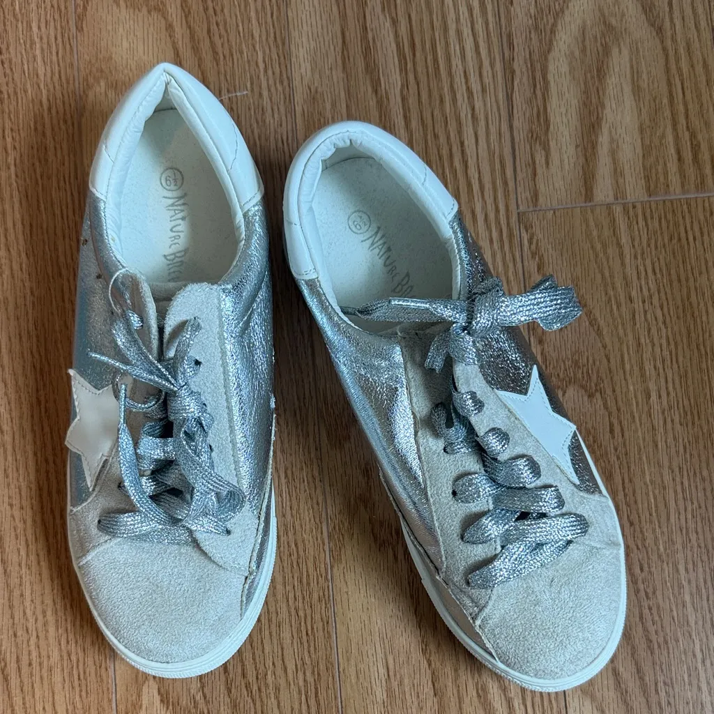 Sparkle and shine with these Nature Breeze sneakers, designed to add a playful touch to any outfit. Shimmering silver metallic uppers catch the light beautifully, while contrasting suede accents and iconic star appliques lend a trendy, eye-catching appeal. The comfortable lace-up design ensures a secure fit, making them perfect for everyday adventures. Elevate your casual look for brunch with friends or a fun shopping trip. Department: Women UK Shoe Size: 4.5 Theme: Retro, Designer Upper Material: Fabric Features: Comfort, Padded, Cushioned, Lined, Stretch Shoe Width: Standard EU Shoe Size: 37.5 Style: Sneaker Type: Athletic Keywords: silver sneakers, glitter shoes, star detail, fashion footwear, casual trainers, comfortable sneakers, everyday shoes, metallic accents, trendy kicks, statement shoes, womens fashion, lace up sneakers