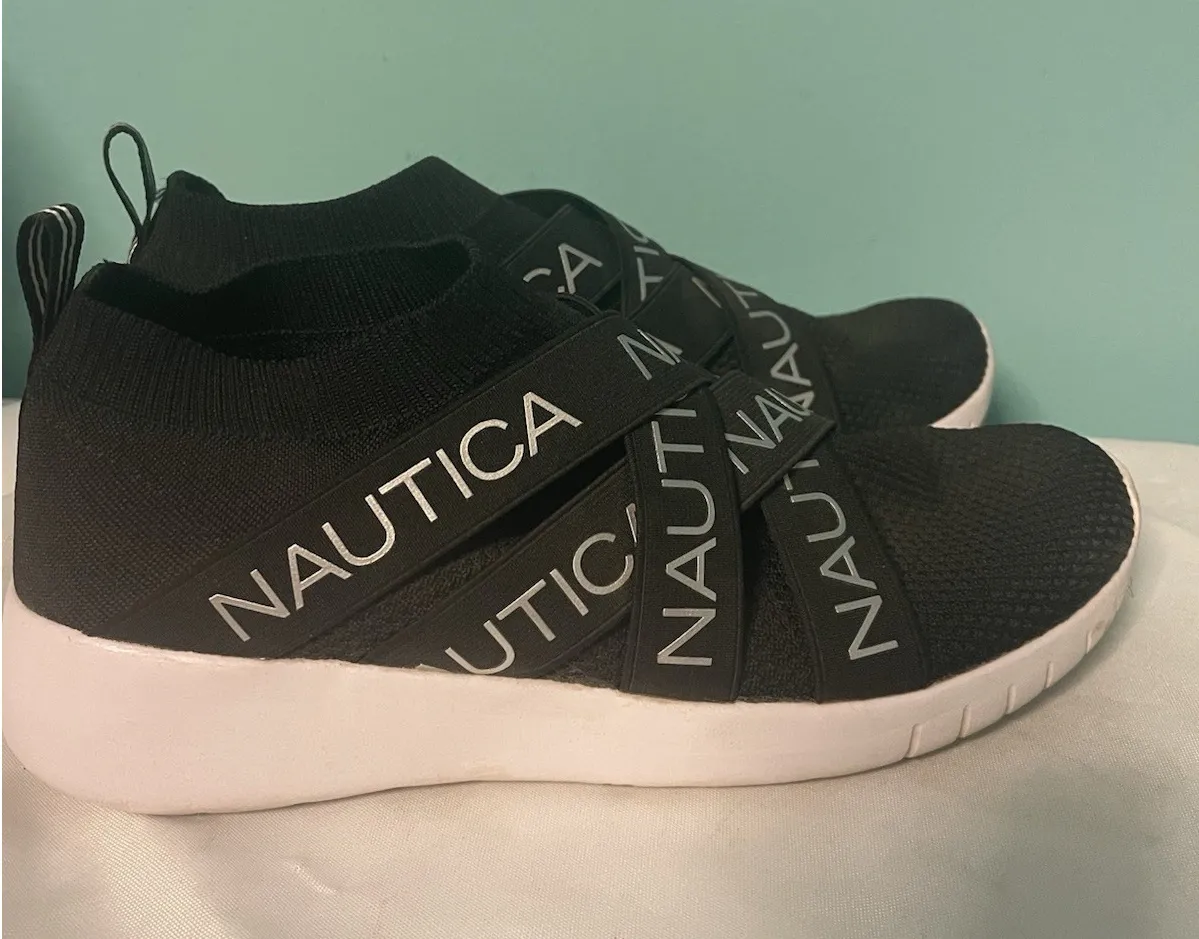 The Nautica Crisscross Logo Straps Slip On Sneakers in Women's size 9, model "Patrika", are black at... Show more