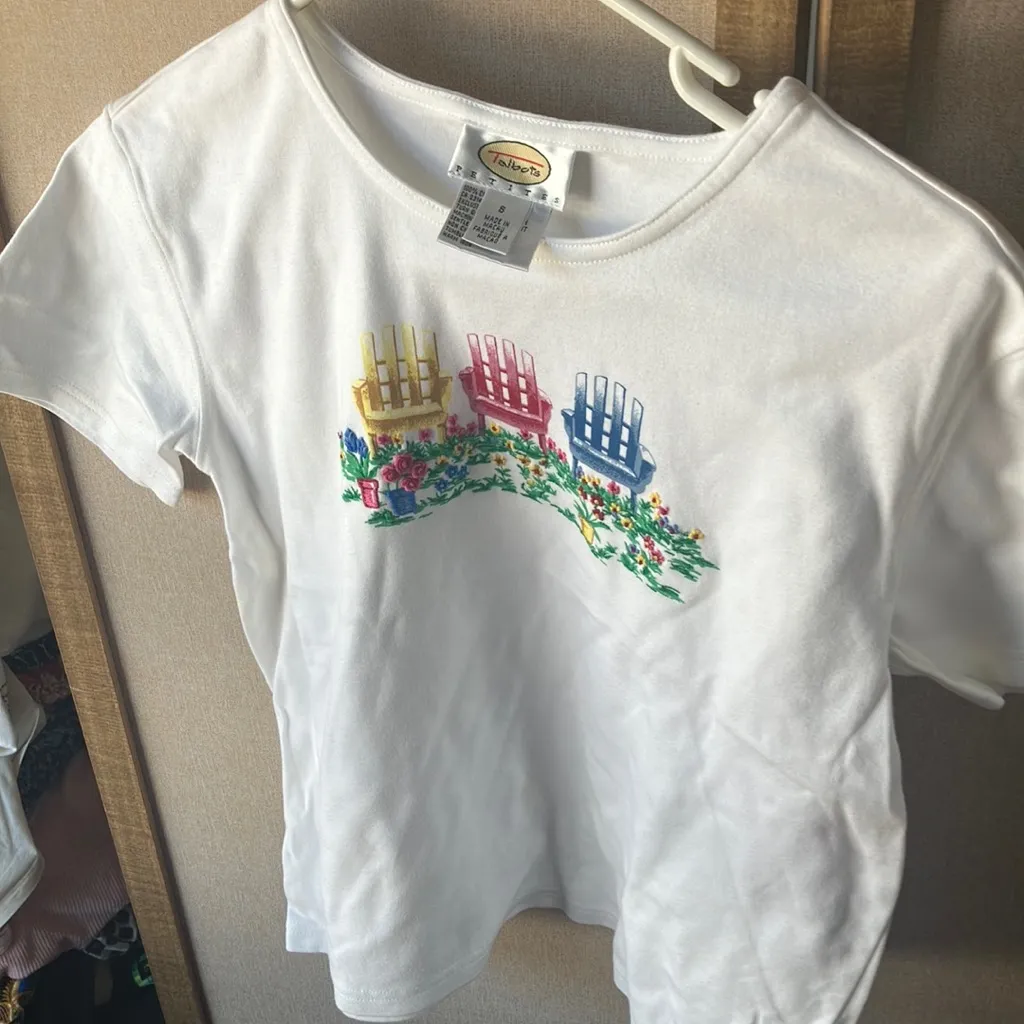 Charming white tee with vibrant chair embroidery. Soft and comfortable for daily wear. RA0714