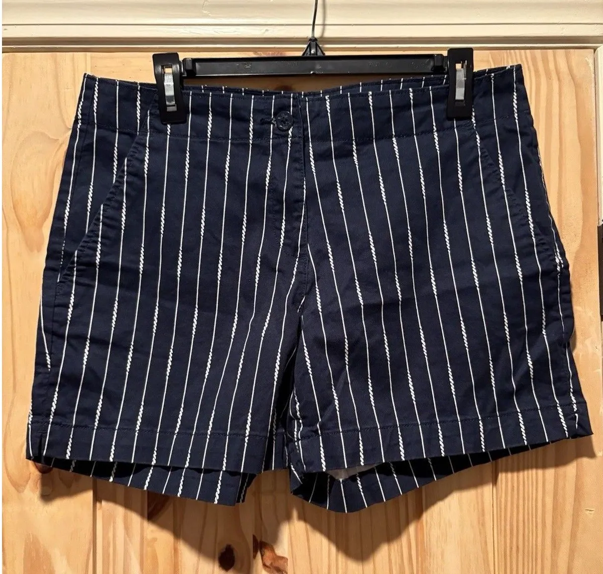 Nautica women’s navy blue and white striped shorts. Classic nautical style, lightweight cotton. Size... Show more