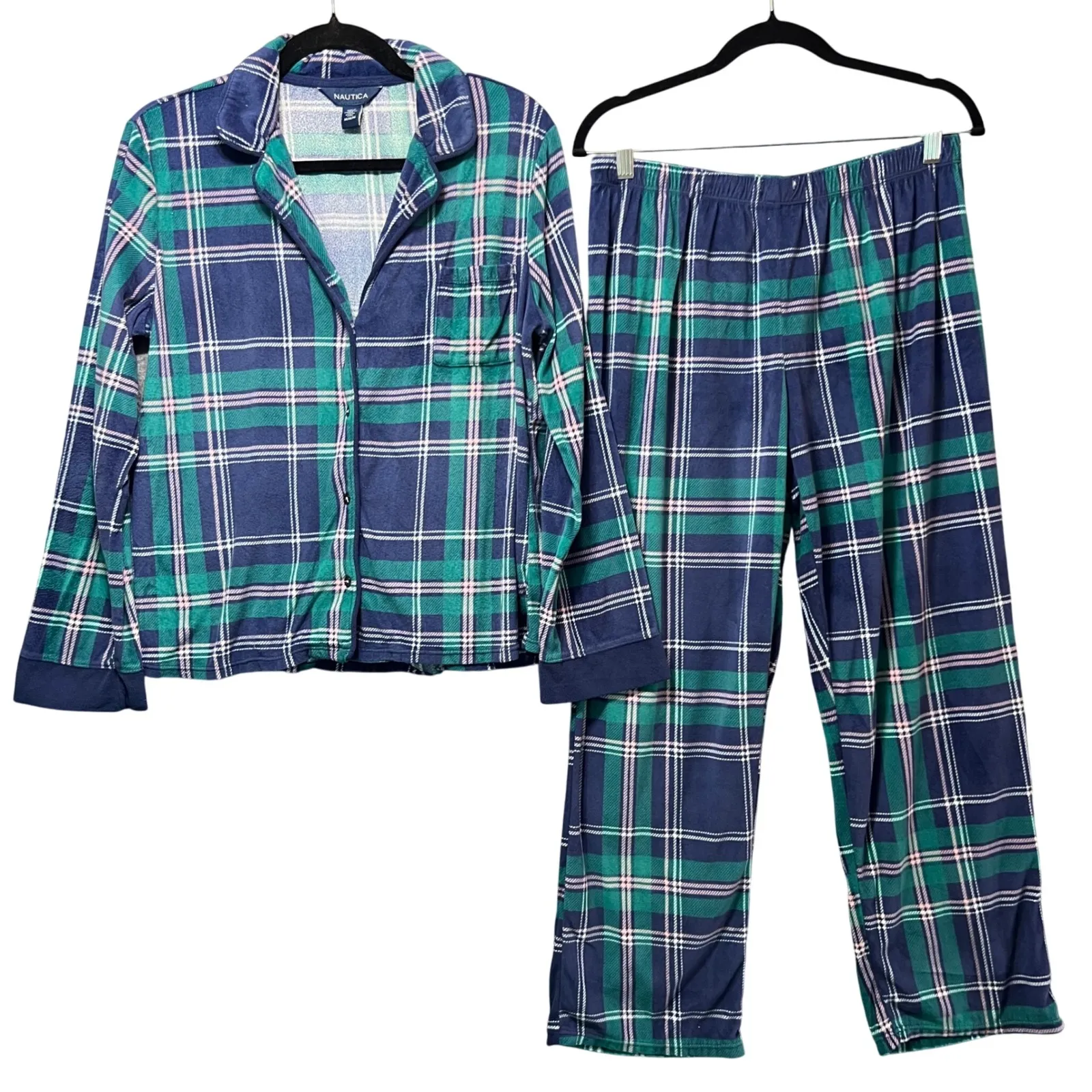 A cozy Nautica pajama set featuring a classic plaid pattern in navy blue, green, and white. This two... Show more