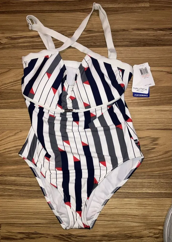 Nautica Women's Cross Back One PC Swimsuit Size 10 White Navy NWT. Condition is New with tags. Shipp... Show more