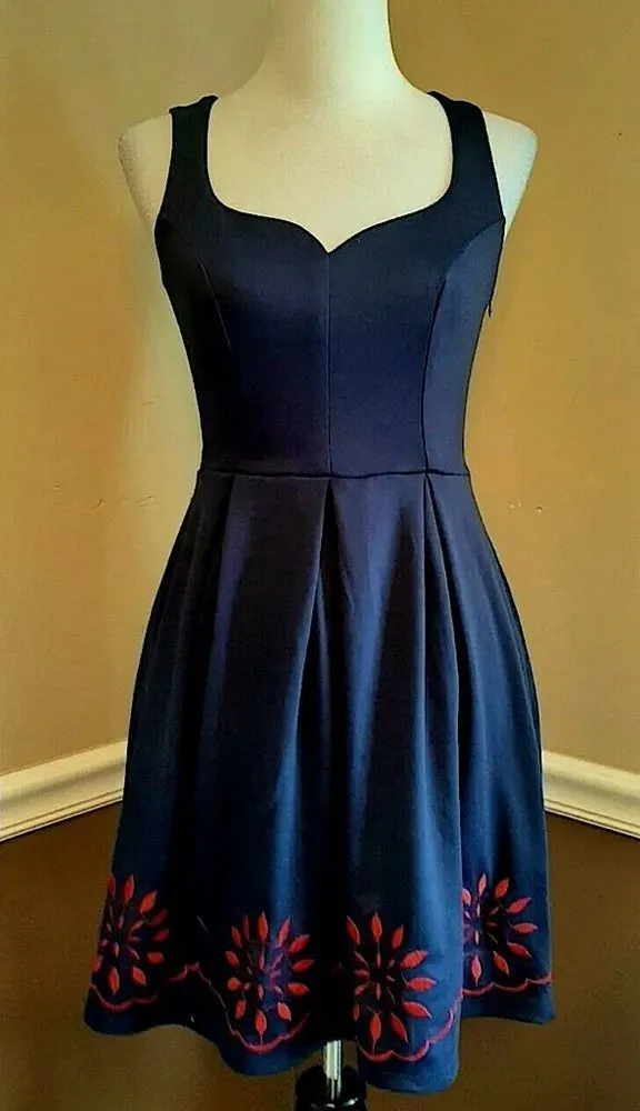 Mystic navy blue sleeveless tank fit & flare dress with red embroidered flowers along the hem. Sweetheart neckline. Fit & flare. Made in the USA. New without tags Sold Out at Modcloth Size Small Approximate measurements are taken across the item laid flat: Bust: 17 inches, stretches to 20 inches Waist: 13 inches, stretches to 16 inches Length: 33.5 inches Shell: Polyester blend. Lined bust only. Fabric has stretch. Clean, smoke-free home and studio. 5 star seller. Super fast shipping! Pin Up, PUG, Rockabilly, cheesecake, 50’s,retro, old Hollywood, retro, special occasion, wedding, party, banquet SKU#B1048 14B