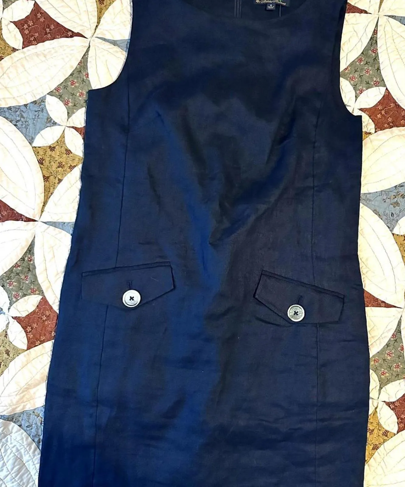 Size 6 Like new condition, smoke free home #linendress #christmasdress #oldmoney #capecod #luxury navy linen, chore pockets, classic style, tailored fit, elegant, timeless, sophisticated, preppy, summer dress, minimalist