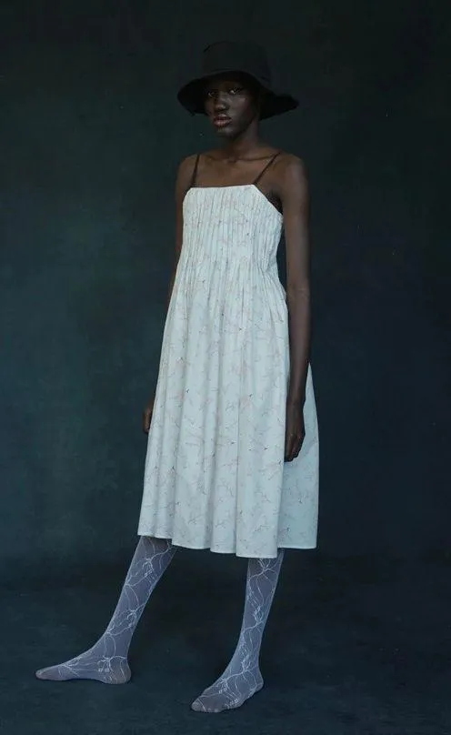 Naya Rea IMAN DRESS Midi Floral White Pink Ditsy Pleated Cotton Fit and Flare. Size UK 12 which converts to a US 8. Good condition. Iman dress is made from 100 % cotton printed with pink ditsy florals, it has a stitched down pleated body which falls into a subtle a line skirt. The dress features fine black contrasted shoulder straps and size invisible zip on the side. 100 % cotton White with pink floral prints Side zip Hand wash in cold water or dry clean ; Design in London, made in Ukrain