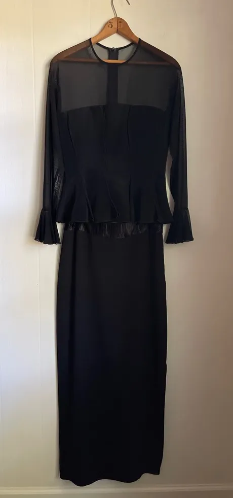 Vintage Joseph Ribkoff 2-Piece Cocktail Dress Women’s Size 8 Black Mesh Bustier Top (no size tag on top) Back Zip Peek a Boo Mesh Poet Sleeve Full Length Skirt Double Layer Slit Satin Pleated Trim Waist Has a small snag in hem of skirt in SECOND layer. Is not visible from top of skirt. See photos. Approximate: Waste Across: 14 inches Length: 39 inches Hips: 18 inches Top: Shoulders: 15 inches Armpits: 16 inches Sleeves: 22.5 inches Length down front: 22 inches Preowned | Vintage Condition | Good Condition Please see all photos and ask any questions prior to purchase. We are happy to help. Thank you for looking! Flaw in hem