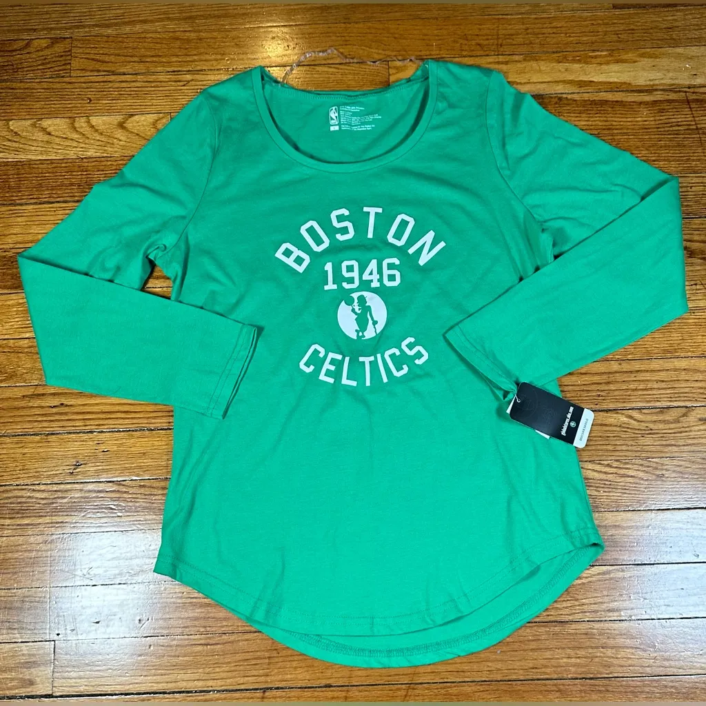 Show off your love for the Boston Celtics with this NBA Women's Green Scoop Neck Long Sleeve Logo T-Shirt. Emblazoned with the iconic team logo of the National Basketball Association (NBA), this shirt is perfect for any fan. Made from high-quality materials, this shirt is comfortable, durable, and perfect for the regular season. Represent the Boston Celtics in style with this NBA Women's Green Scoop Neck Long Sleeve Logo T-Shirt. This shirt is designed for women and boasts a size L. The green color is perfect for showing off your team spirit, while the long sleeves make it ideal for cooler weather. Manufactured by a reputable brand, this shirt is a must-have for any basketball fan.