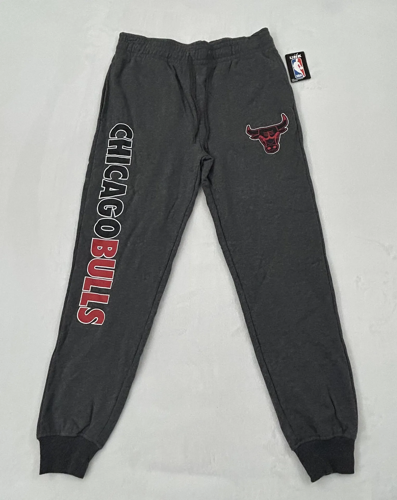 Chicago Bulls NBA Basketball UNK Gray Graphic Logo Joggers Sweatpants size L Brand new with tags never worn in excellent condition. Made by UNK x NBA. Chicago Bulls Dark Gray Graphic Logo sweatpants joggers. Has side pockets and back pocket. Also has drawstrings to tighten. Really nice looking pants. Please see all pictures for details