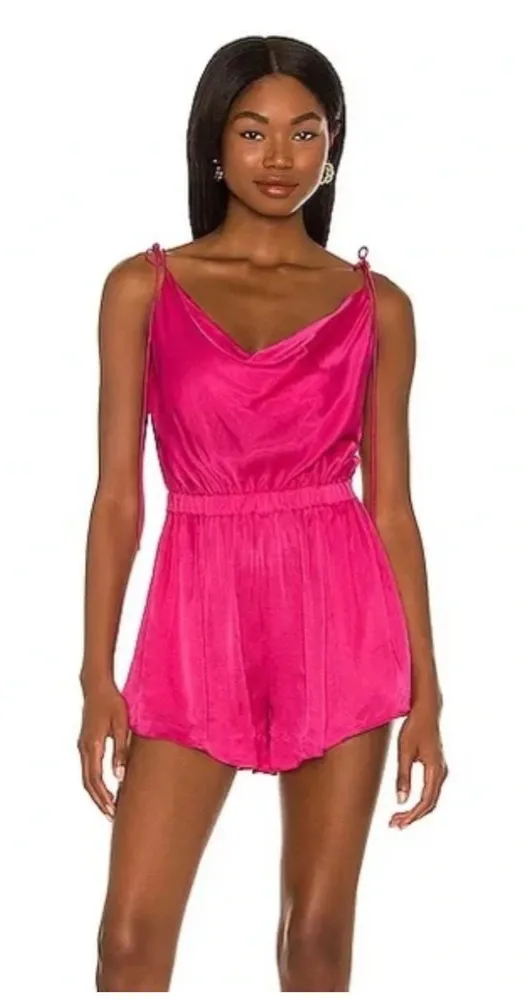 NBD Maelle Romper in hot pink Self-tie shoulder straps, satin fabric with cowl neckline, elastic wa... Show more