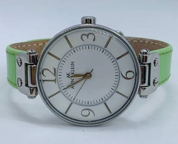 Anne Klein 10/9169 womens Quartz analog watch silver tone 34mm case , green leather strap, used Cond... Show more