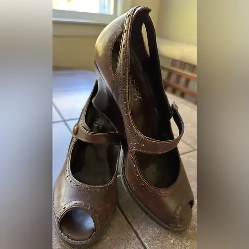 Franco Sarto Dark Brown Leather Pep Toe Wedge Heel Shoe With Non Adjustable Strap Sz 6M 3 Inch Heel