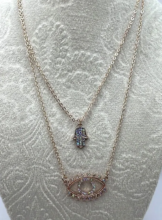 A high-polish layered necklace featuring cable chains, dangling eye and hamsa hand pendants, rhinestone embellishments, and a lobster-clasp closure. Rose Tone with Aurora Borealis Rhinestones 16” length 3” extender