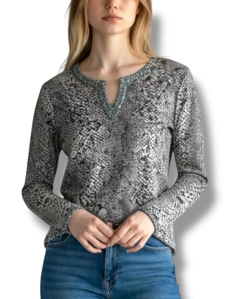 The Neiman Marcus Size M Gray Animal Print 100% Cashmere Sequin Trim Keyhole Sweater is a stylish an... Show more