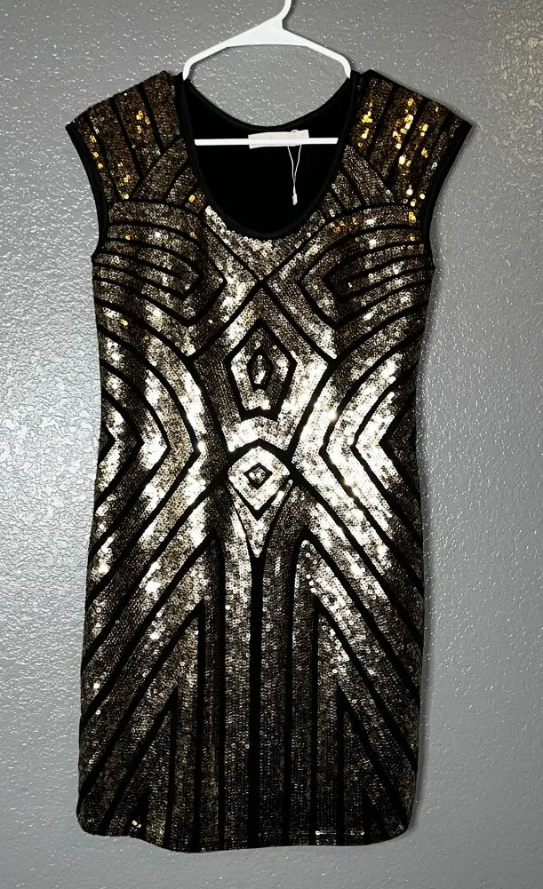 Stunning black and gold sequin bodycon dress by Neslay Design. Features an intricate geometric patte... Show more