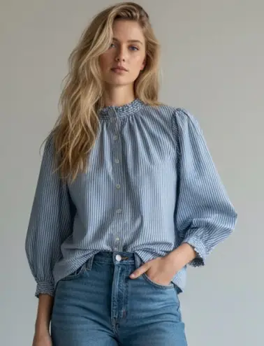 Never a Wallflower Elastic Collar Top MSRP $258 Size Small Laying Flat / Approximately Armpit to Armpit 21” Length 21.5” Excellent Preowned Condition Pretty, easy to style, and anything but boring. Our Elastic Collar Top is a real stunner. Features include elasticated three-quarter ruffle sleeves, front button closure, and blue striped poplin fabric. 3/4 elastic sleeves Front button closure Ruffle collar Easy fit