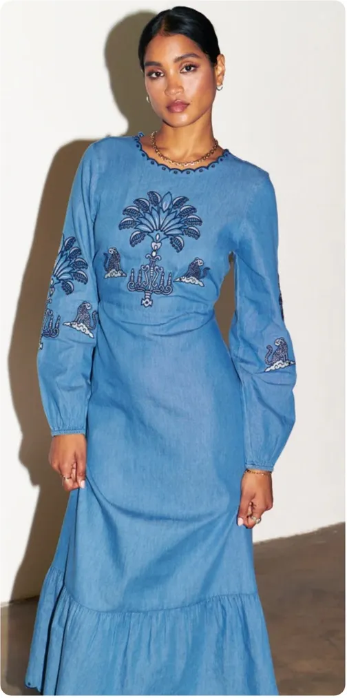 This is a blue midi-length denim dress featuring unique embroidered details on the chest and sleeves... Show more