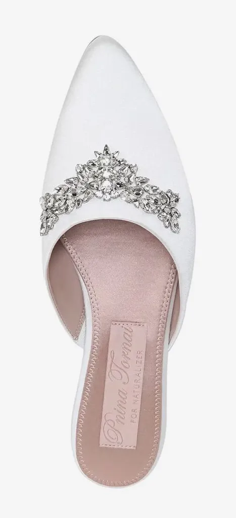 Pointed and poised, these Pnina Tornai for Naturalizer women's slip on shoes with rhinestones exude elegance. Satin upper with pointed toe. Contour+ Comfort technology for a premium fit and all-day comfort experience. Non-slip metallic outsole with engraved quote. 0.5-inch heel. A captivating collection of wedding and occasion footwear for brides, bridal parties, mothers of the couple and guests. Forever elegant silhouettes with all day wearability, available in an inclusive range of sizes and widths. The Beautiful Fit. Features 0.5" heel Slip on Fabric upper, Fabric lining, Leather sole Spot clean Imported