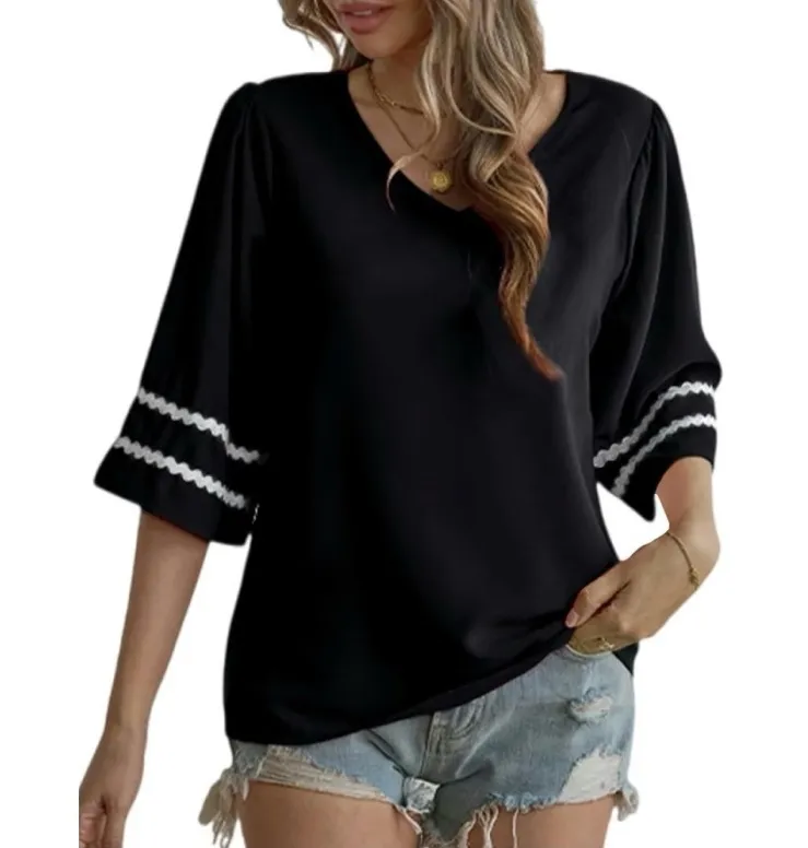 Black 95% polyester 5% spandex Machine wash Versatile blouse for both office and evening wear. Chic 3/4 sleeves and flowy silhouette provide comfort and style. Pairs well with jeans, leggings, or a skirt for varied looks. Suitable for casual and formal occasions alike. Made from soft and lightweight fabric for all-day comfort.