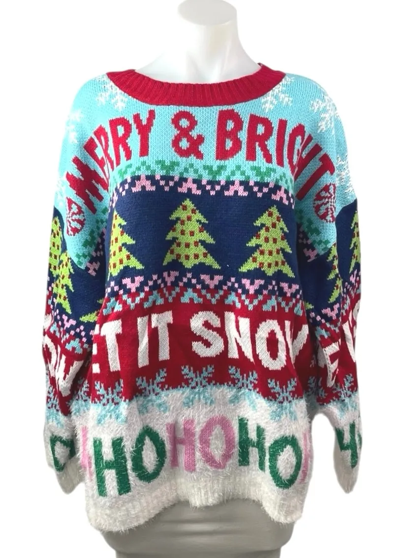 NEW 33 Degrees Merry & Bright Multicolor Christmas Long Sleeve Oversized Holiday Sweater Top Size L... Show more