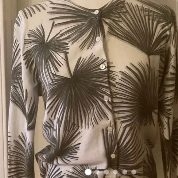 New Day cardigan with palm leaf print. Fabric is a soft cotton blend. Crew neck; hits at waist. Rib... Show more