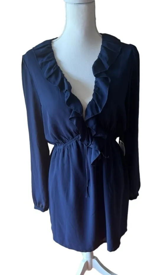 new Chic and feminine dress from About Us in a deep navy blue shade. Features a plunging V-neckline with ruffled trim, long sleeves, and a flattering waist tie for a fitted silhouette. A versatile piece, ideal for date nights, parties, or casual chic wear. Brand: About Us Color: Navy Blue Size: 1 (Juniors) Style: Ruffled plunging V-neck mini dress with waist tie Thanks for shopping, open to offers and bundles! All orders ship within two business days. Majority ship by the next business day! Smoke-Free and Pet Hair-Free House (My cats are naked)