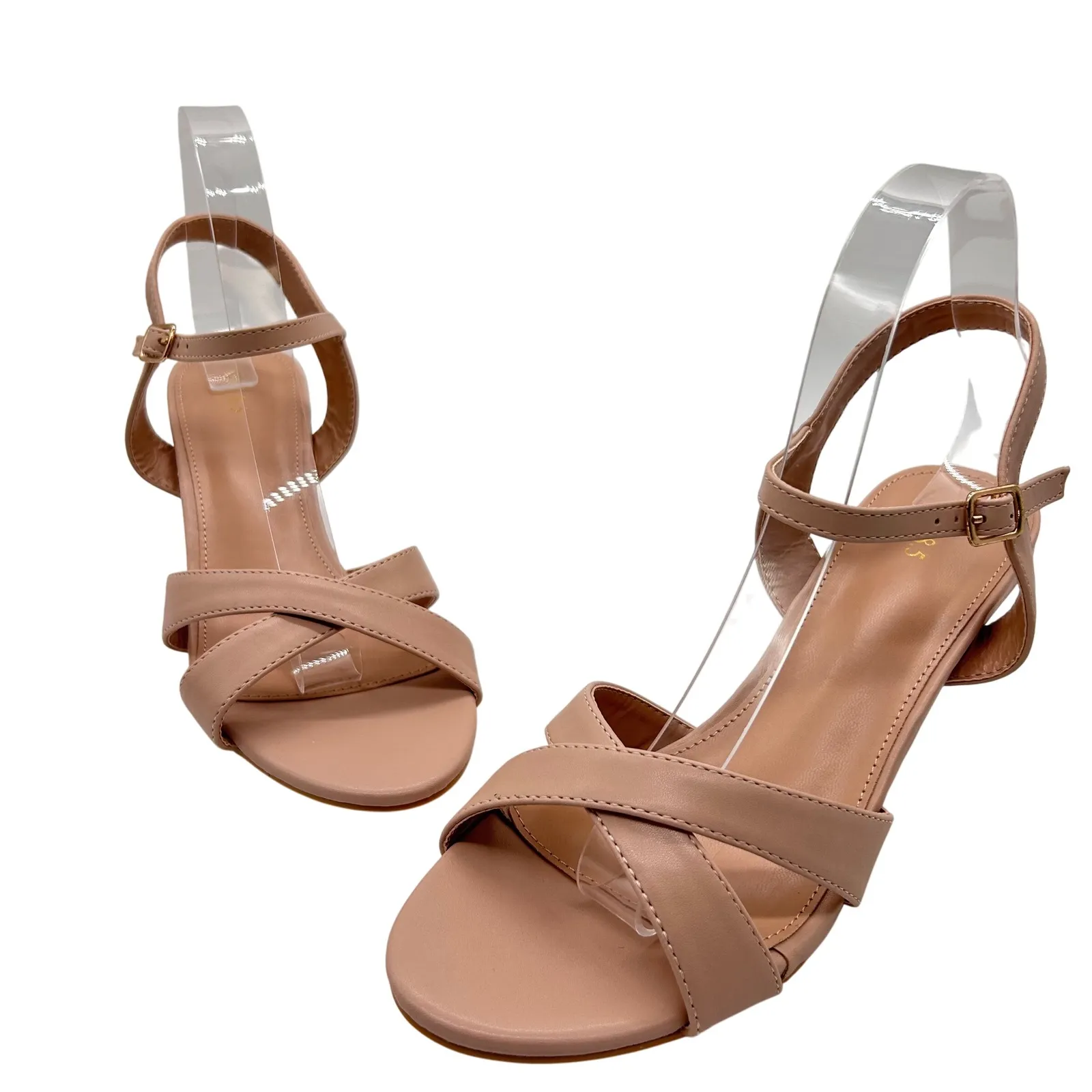 Color: Tan Style: Strappy Department: Women Upper Material: Faux Leather, Synthetic Type: Heel Heel Style: Kitten Toe Shape: Round Toe Heel Height: Low (1-1.9 in) Pattern: Solid Closure: Buckle Features: Ankle Strap, Adjustable, Comfort Model: Criss Cross Kitten Heel Condition: New w/o Box; w/o Tags Keywords: women's heels, ankle strap heels, criss cross sandals, kitten heel, dress shoes, formal heels, party shoes, nude heels, pink heels, size 8.5 heels, ladies footwear, stylish heels, elegant sandals, women's sandals **Fast Shipping / Smoke Free Home**