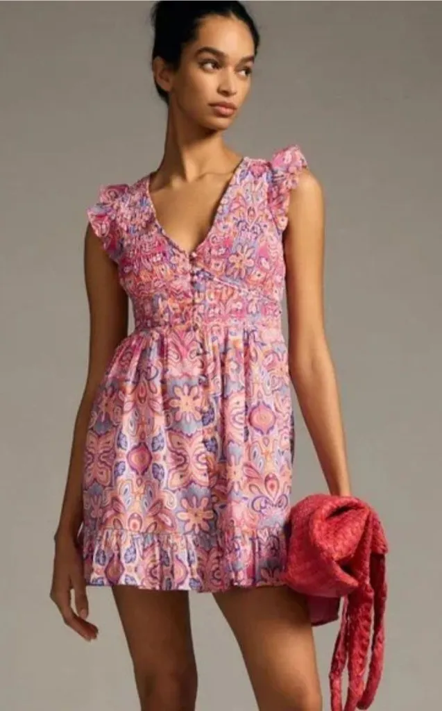 This beautiful Anthropologie mini dress brings a vibrant, feminine touch to warm-weather dressing. Crafted from soft 100% cotton with a full lining, it features a colorful paisley-floral print, a flattering smocked bodice, and sweet ruffled cap sleeves. The V-neckline and flowy skirt create an easy, breezy silhouette that works perfectly for daytime outings, vacations, or spring events.