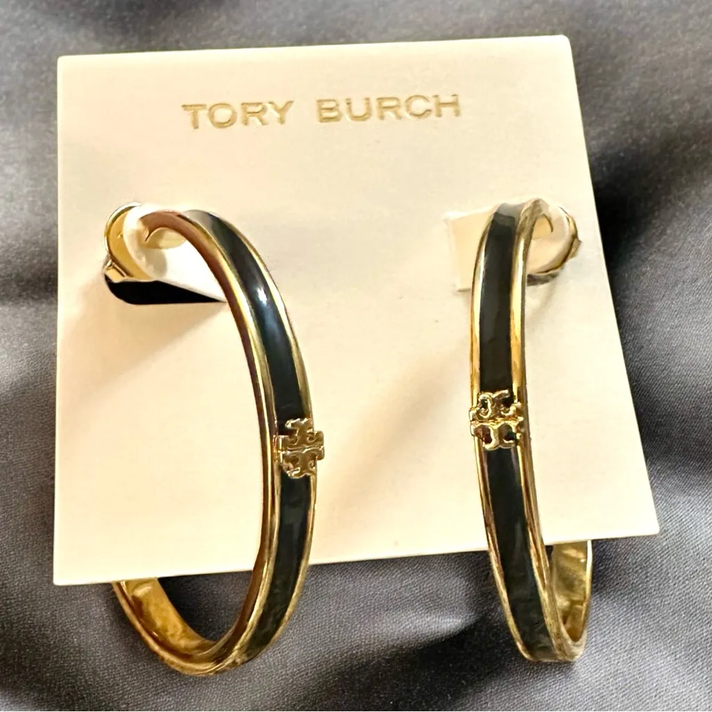 Highlights: gold-tone/black brass medium hoop design; approx 1.6” signature Double T motif enamel de... Show more