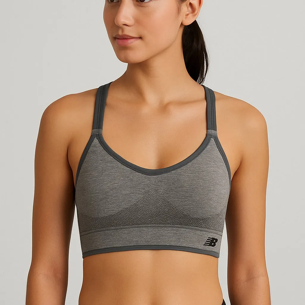 Comfortable and supportive New Balance seamless racerback sports bra in a sleek heather gray. Design... Show more