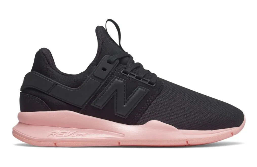 Chic and comfortable New Balance sneakers. Black upper with pink accents. Ideal for daily wear.