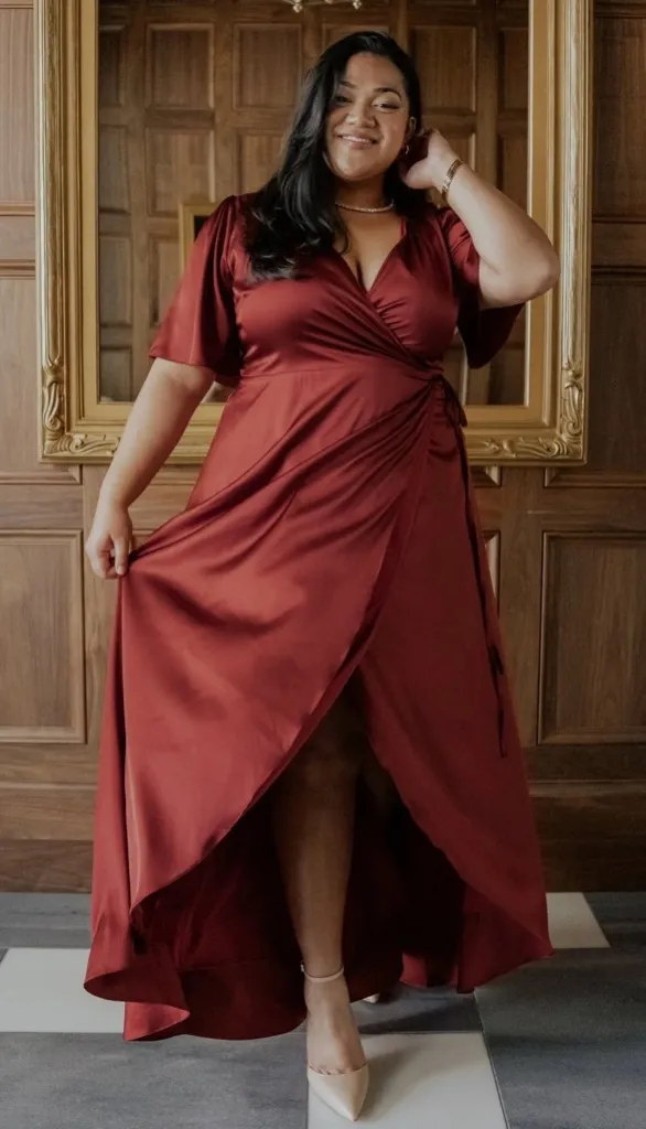 New with tag Feel glamorous in an instant with this stunning gown Stunning Terracotta color Satin material with slight stretch and lots of shine True wrap style with V-neckline Short flutter sleeves Wrap ties at waist loop through a hole in the side to tie Maxi length with tulip style skirt - or midi, depending on your height Silhouette creates movement and shows just enough leg Cocktail, family photos, maid of honor, matron of honor, mother of the bride, mother of the groom
