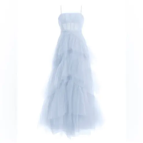 Details This elegant sheer gown with bustier-inspired bodice is finished with a tiered ruffle skirt... Show more