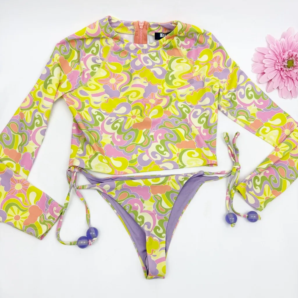 NWOT Beach Riot X Free People Rashguard Bikini Swim Set Lindsay Soleil 70s Swirl Print. Size Large. Beach Riot comes through with a '70s-inspired multicolor print in their new Lindsay Rashguard Long Sleeve Top and Swirl Soleil Tie Side Bikini Bottom. The long sleeve top is a cropped length and has a rear zipper closure. This classic low-rise bikini bottom is taken to the next level with large beaded accents, adjustable tie sides, and cheeky seat coverage. • swirl print rash guard top with rear zip and pull tie • swirl print bikini bottom • Lined • Low-rise • Tie sides • Cheeky seat coverage • Large beaded accents • 80% recycled nylon, 20% lycra New condition! Stock photos are to demonstrate fit and style. Beach Riot X Free People Rashguard Bikini Swim Set Lindsay Soleil 70s Swirl Print.