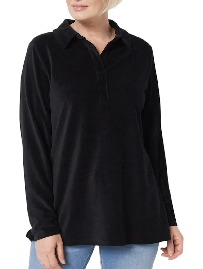 Belle by Kim Gravel Corduroy Pop Over Tunic. The cozy style of corduroy in a tunic! It's the perfect chilly-season top to mix up your everyday outfit collection. Pullover. Collar. Split placket. Back yoke. Long sleeves. Short slit at each side of the hem. Slightly longer length. Semi-fitted; designed to follow the lines of the body with added wearing ease. Super soft, stretchy corduroy fabric. Lighter and softer than traditional corduroy used for bottoms. Feels like a light sweatshirt or heavy textured tee. Makes for a comfortable shirt. Material: 60% cotton 37% polyester 3% spandex. Brand: Belle by Kim Gravel Style: A518250 Color: Black Size: XXS Retail Price: $71.00 Condition: NWOT new without tags. Never worn. No price tags are attached, but it comes in the original packaging. Approximate measurements laying flat: Pit to pit 18" Length 26" Styles Cord Popover Fall Fashion Autumn Tops Winter Velour Look Velvet Feel Versatile Work Casual Outfits 2XS QVC Brands