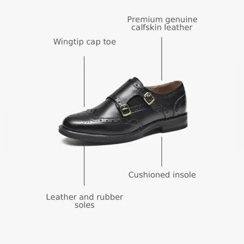These monk shoes made from genuine leather feature the brogue style and double buckles design. The double buckle design looks more stylish, pigskin lining and insole make the shoe more breathable and comfortable. Upper: 100% Cow Leather Lining: 100% Pigskin Insole: 100% Pigskin Outsole: 100% Rubber Heel Height: 3 cm