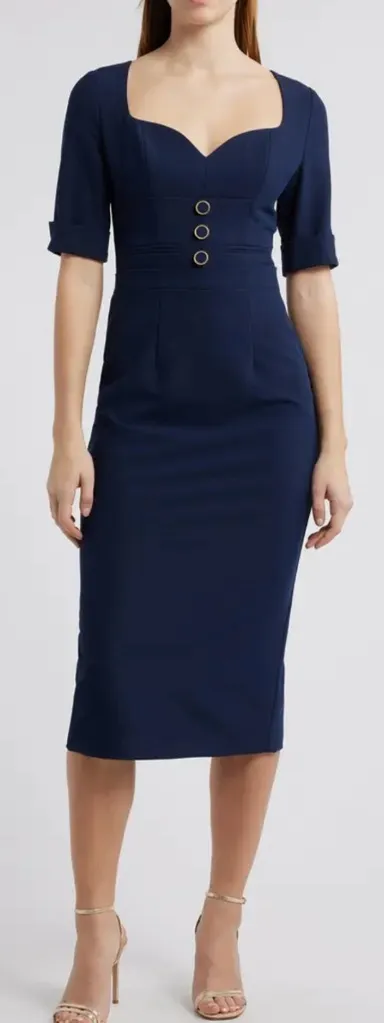 New without tags Size 2 Color Navy Gleaming, faux buttons shine along the bodice of this curve-hugging midi dress made with enough stretch to keep you moving from your office to your dinner date. 48" length (size 2) Hidden back-zip closure Sweetheart neck Short sleeves Back slit Stretch lining 62% polyamide, 32% viscose, 6% elastane Dry clean Made in the USA of imported fabric Item #10646182 Tags: Influencer Statement Piece, bridesmaids, black tie, gala, formal wear, prom, homecoming, pageant, wedding guest, bridal, wedding, bridal shower, mother of the bride, mother of the groom, rehearsal dinner, bachelorette, pageant, prom, homecoming, wedding, engagement photos, special occasion, little black dress, gala, Graduation, holiday parties, pageant, Quinceañera, formal, black tie, cocktail, Maid of honor, Special occasion, Designer Event, Dinner gown, Photo shoot, Formal event, Celebrity Red Carpet Luxe Luxury, Holiday, Vacation Resort wear, Beach dress, Spring, Summer, Fall, Winter, viral
