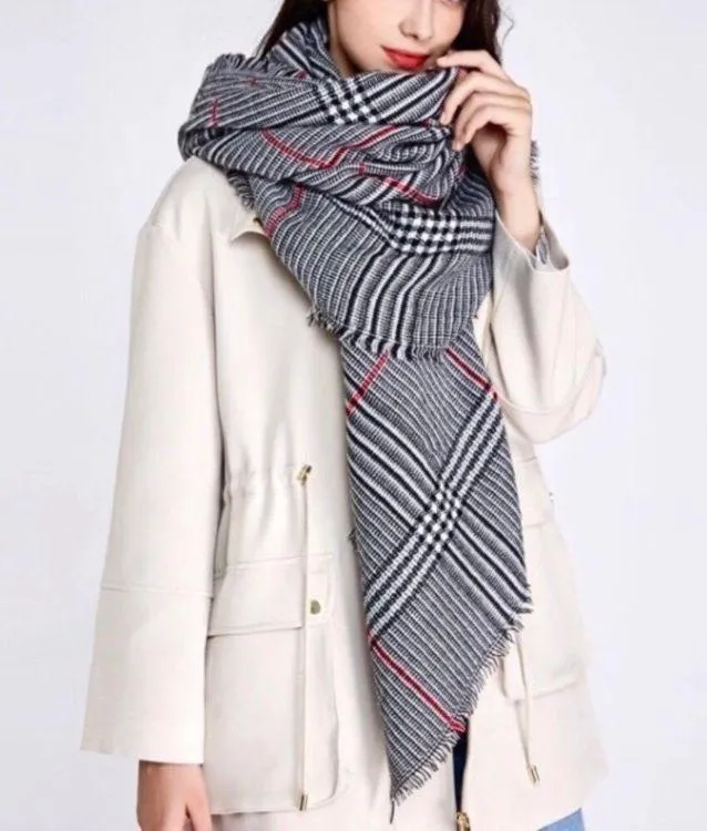 Huge and soft! 😍 Adorable large blanket scarf with fringe trim featuring a super chic black, white and red glen plaid classic houndstooth/grid pattern. Great for Alabama Crimson Tide, University of Georgia, Ohio State University, and University of Oklahoma football fans, too! Soft acrylic. Hand-wash. App. 135x175cm, or app. 4.5ftx5.5ft (53inx69in). Boutique: brand new in sealed packaging. Makes a fantastic Christmas gift! 🎁 ❌No trades/swaps or holds.