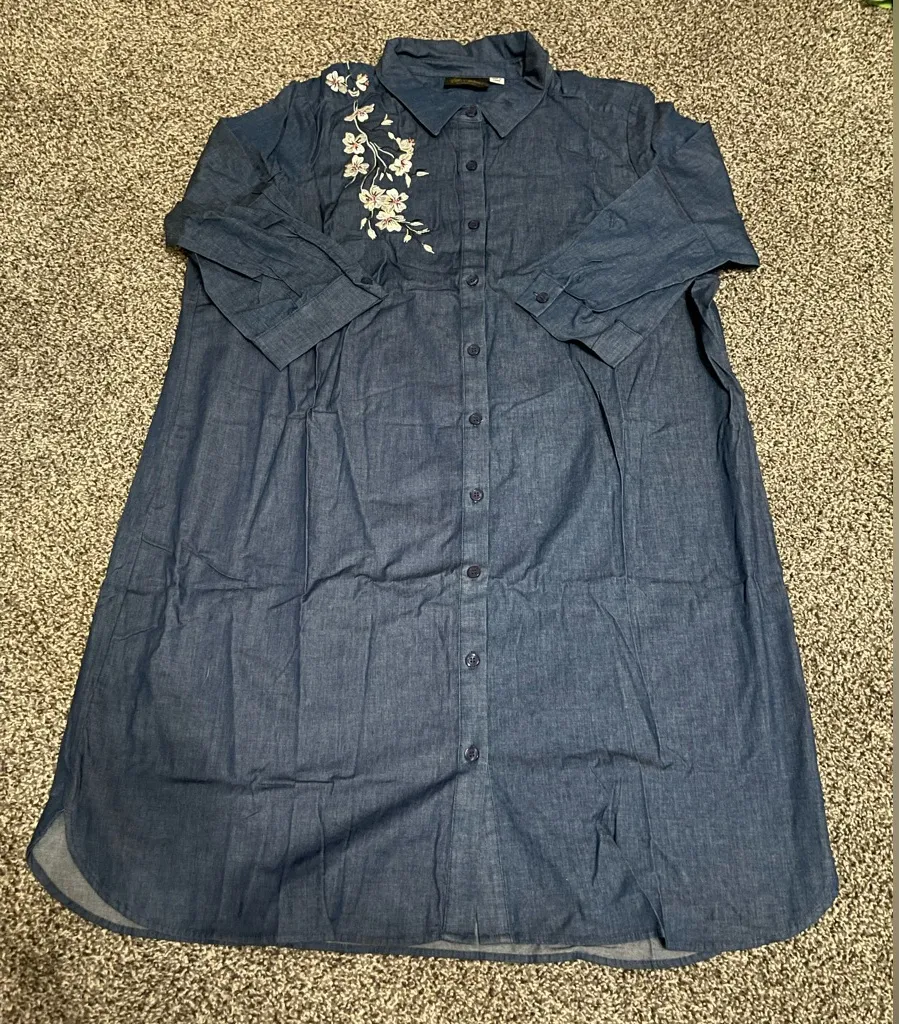 New in bag (opened for pics) Bob Mackie Wearable Art Indigo Wash with white Flowers Embroidery Denim Shirt Dress Medium 3/4 sleeve (approximately 13 7/8 in) 97% cotton, 3% spandex Approximate length=39 1/8 in Approximate pit to pit=23 7/8 in Great condition BUT from my grandma’s house and likely will smell like her perfume Feel free to create a bundle or shoot me an offer! Smoke free, 1 dog home **might arrive wrinkly** Stylish denim shirt dress with floral embroidery. Perfect for casual outings.