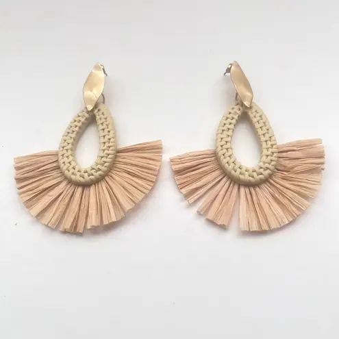 These fashion boho earrings feature gold tone, straw, and wicker like details. The wicker look is a light plastic or resin material. (Not sure of exact material). Post backs . See pics for more details.