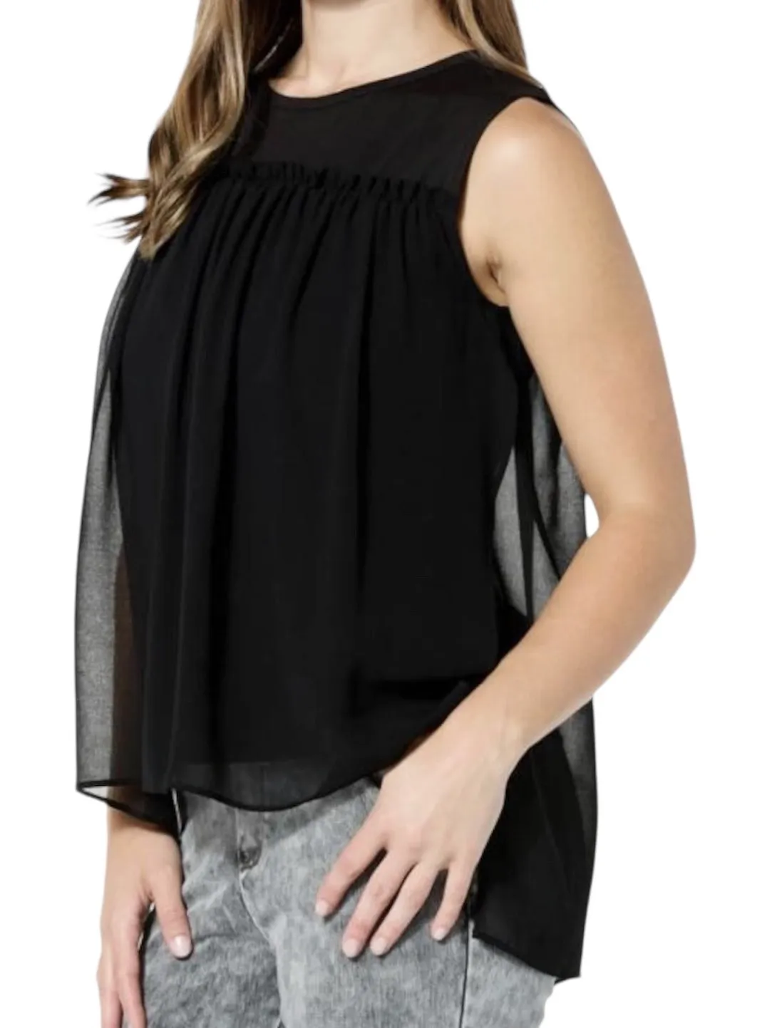 C Wonder by Christian Siriano Mixed Media Top. Pullover. Crewneck. Sleeveless. Mixed media fabrication. Super soft jersey knit with sheer single georgette overlay. Shirring detail with ruffles at the yoke where the overlay starts. Overlay is split at each side; front and back panels are loose and flowy. Hi-low hemline; slightly longer at the back. Underlay is more fitted, while the overlay is loose-fitting and generously sized for ease of movement and fabric drape. Body material: 90% polyester 10% spandex. Overlay material: 100% polyester. Brand: C. Wonder Christian Siriano Style: S61506 Color: Black Size: XS extra small Retail Price: $49.95 Condition: NWT new with tags Approximate measurements laying flat: Pit to pit 16.5" Front length 23" Back length 26" Styles Tank Tops Tanks Black Shirts Flowy Fun Blouse Mixed Fabrics High-Low Hem Designer Collaboration Going Out Tops