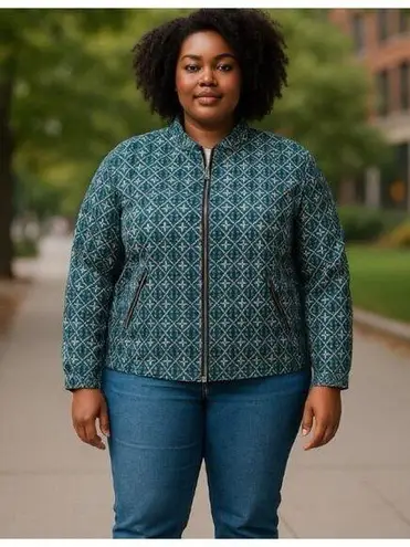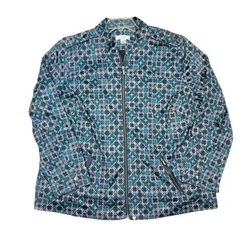 New CJ Banks Geo Print Zip Up Jacket Womens Plus 2X Teal Gray Shiny Casual Coat Size: 20/22W 2X Me... Show more