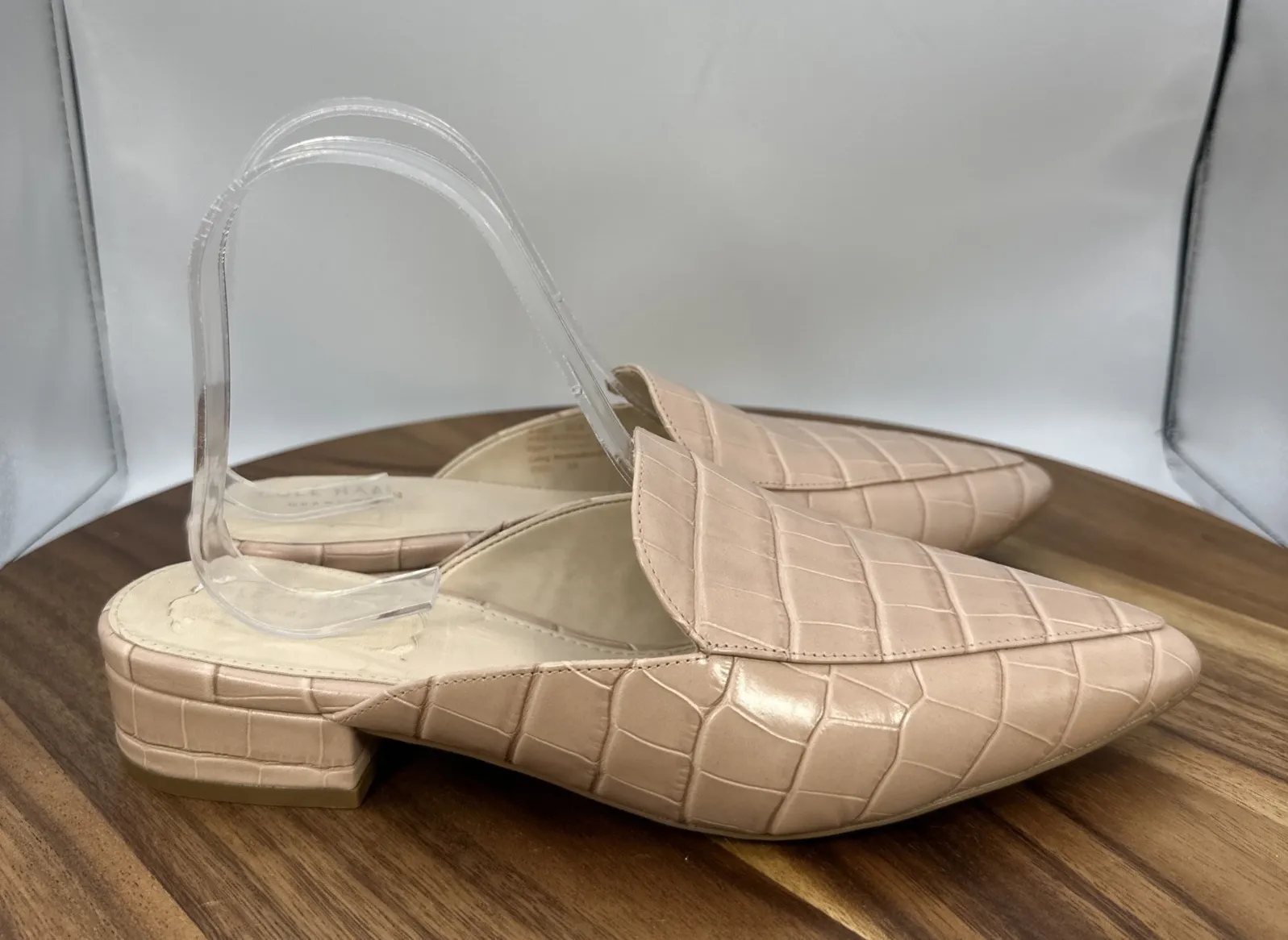 Slip on Leather upper Pointed toe Block heel height 1.5" Brand new with tags. Right shoe has peeli... Show more