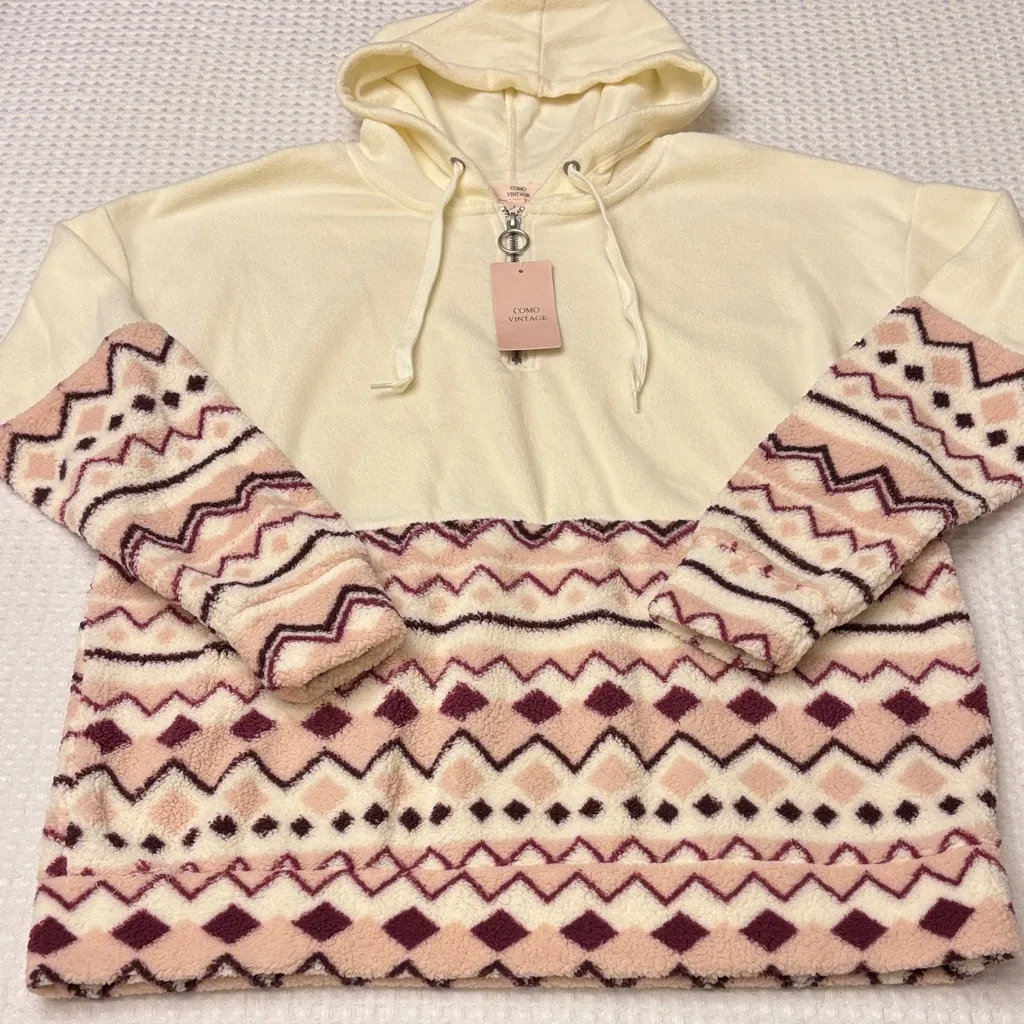 NEW! With tags! COMO VINTAGE Fleece Hoodie Sweatshirt Size: Large Drawstring hoodie 1/2 zip front with ring zipper Ivory top, with Geometric design in shades of Pink and Purple Zig zags and diamonds in the design Super soft and cozy Easy care Bin #4
