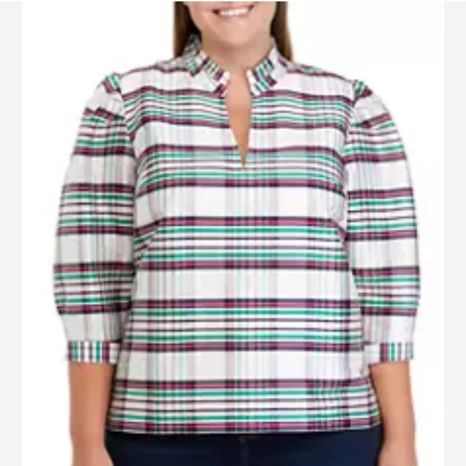 Crown & Ivy Plaid Holiday Top 3/4 Sleeve Blouse Notch V Lined Preppy Glam New with tags $69.50 Size... Show more