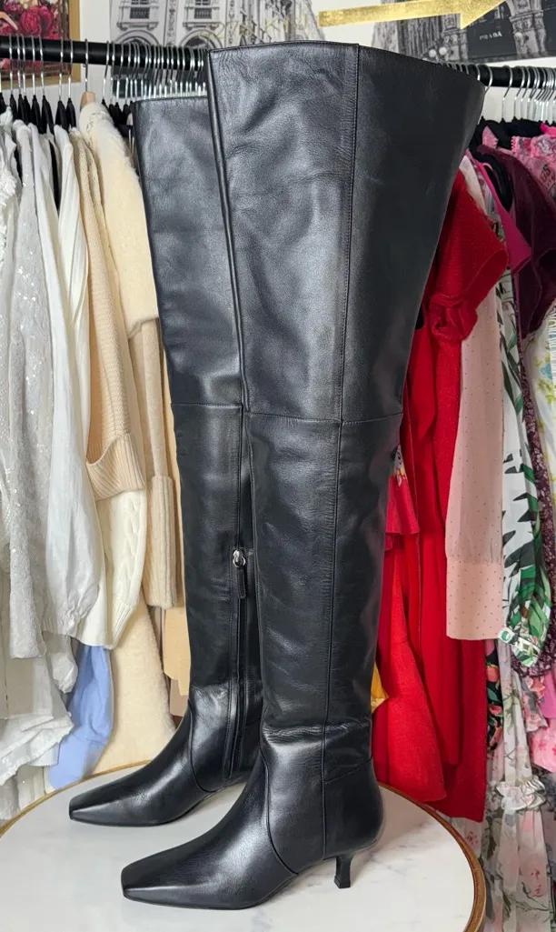 So good π€ Brand new with dust bag only. Size EU 35.5. - Cult Gaia Serena thigh high boot with a sleek, sculpted silhouette - Smooth black leather upper with a structured shaft for a refined finish - Square toe and low kitten heel for modern polish and all-day wear - Cushioned insole for comfort without sacrificing style - Leather upper with synthetic sole, imported craftsmanship - Approx. 1β heel, approx. 27β shaft height, pull-on style Style Aesthetic: modern chic, minimalist luxury, quiet luxury, elevated basics, sleek tailoring, contemporary feminine, polished street style, refined edge, capsule wardrobe essential, model off-duty, city girl aesthetic, understated elegance, fashion editor style, clean girl aesthetic, power dressing, modern classic, effortless sophistication