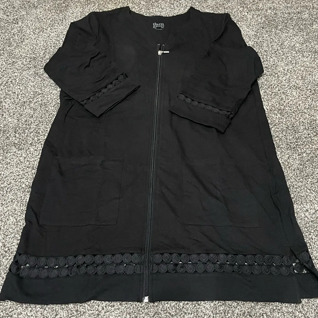New in bag (opened for pics) Denim & Co Beach Black Long sleeve (approximately 15 3/8 in) Has pockets Zip-Up Swim Bathing Suit Cover Up Has Circle Trim along the bottom and the end of the sleeves Medium 95% cotton, 5% spandex Approximate length=35 1/4 in Approximate pit to pit=21 5/8 in Great condition BUT from my grandma’s house and likely will smell like her perfume Feel free to create a bundle or shoot me an offer! Smoke free, 1 dog home **might arrive wrinkly** Stylish black jacket featuring a zip-up front and decorative circle trim. Perfect for layering.