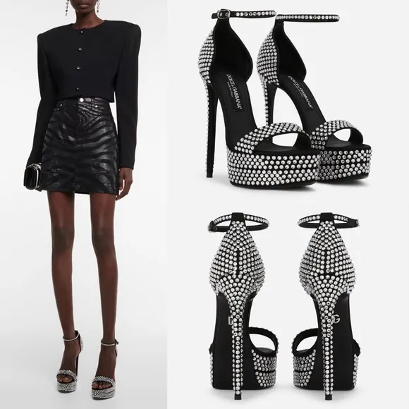 So stunning! 🖤 Brand new - no box (will be shipped in a brand new replacement box). Missing one stone - see last photo + video. Features a satin material covered in all-over rhinestone appliqué, a tall slim stiletto heel, a round open toe, a buckle ankle strap, a platform and a leather lining + sole. Color: Black/Silver. Made in Italy. Size IT 40.5 - fits like a US 10. • Heel height: 145 mm/6 inch • Platform height: 40 mm/2 inch Disclaimer: PLEASE know your European shoe size, as most designer shoes run more narrow and typically a half to full size small. Please read online reviews before or do an in-store try-on before purchasing or ask me any and all questions!
